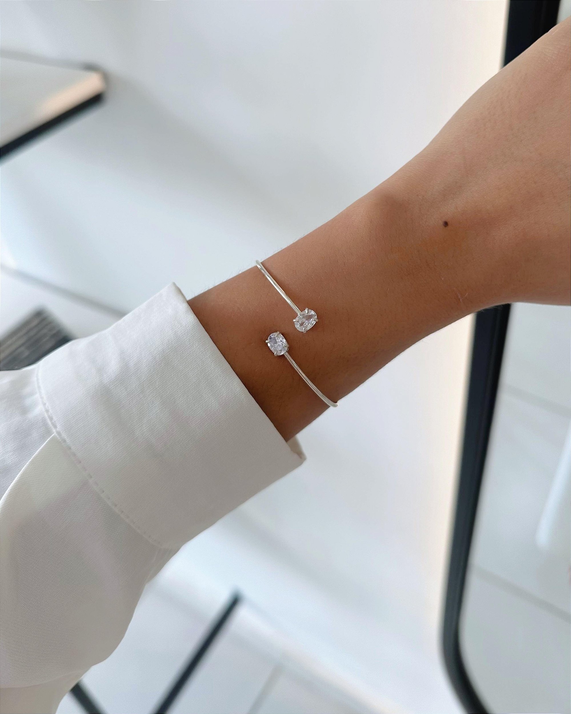 Bracelete em prata 925 adornado com pedras de zircônias na cor cristal, oferecendo um toque de brilho e elegância. Este modelo é regulável, permitindo que você o use tanto na parte superior do antebraço quanto no pulso, ajustando-se ao seu estilo e conforto.