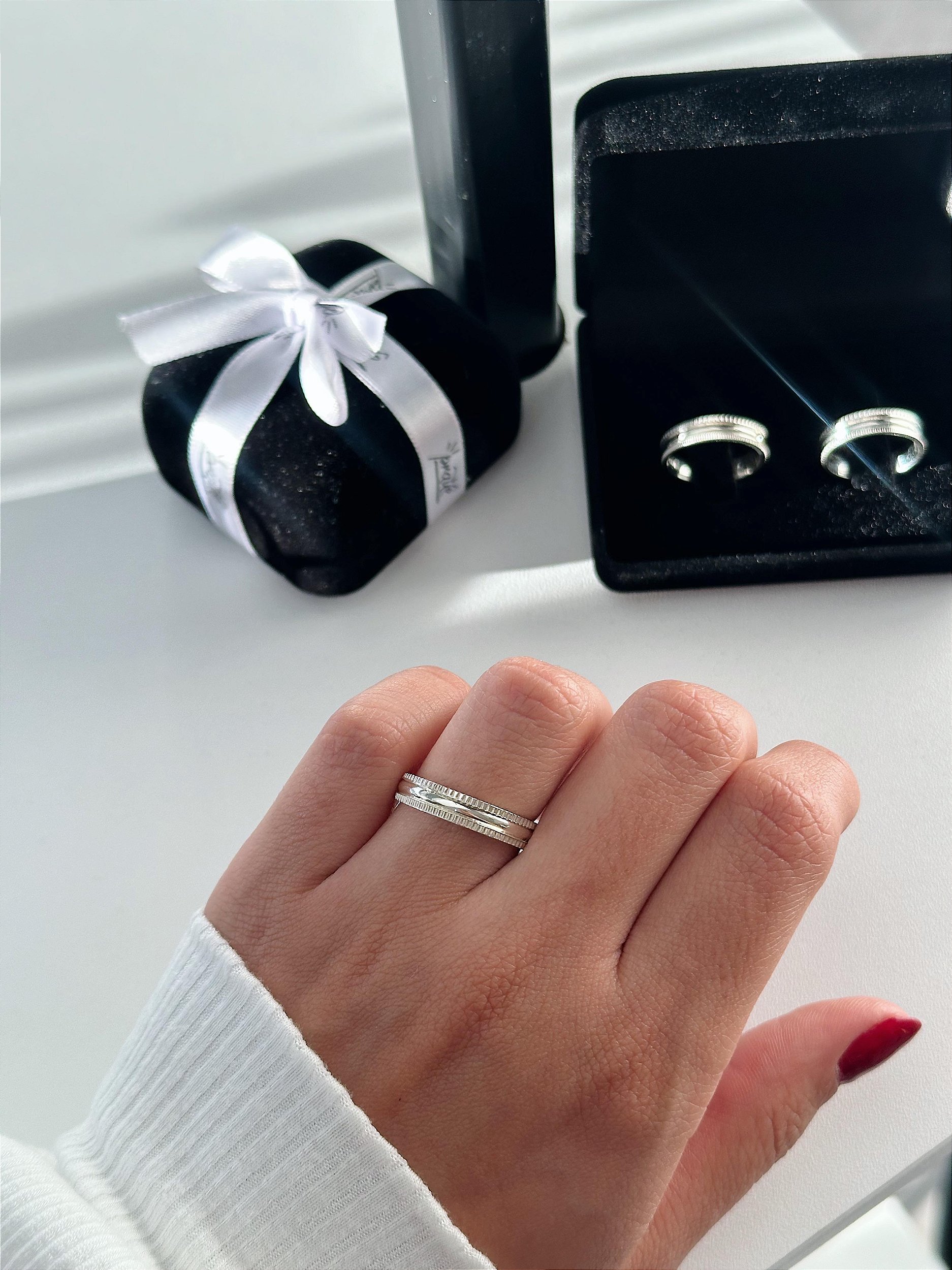 Nossas alianças são feitas com prata 925 e não possuem níquel em sua composição, o que é menos provável que cause reações alérgicas, proporcionando conforto e confiança.